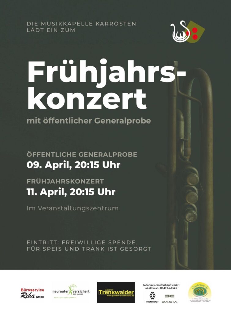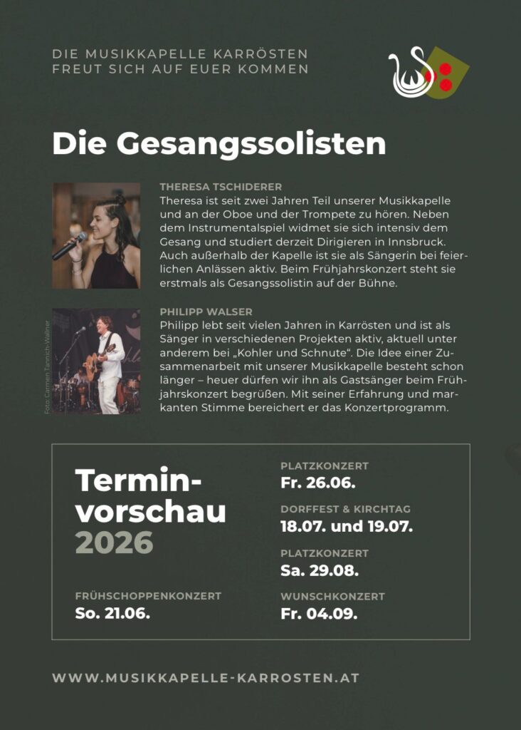 aktualisiert am 29. März 202629. März 2026Aktuelles Einladung zum Frühjahrskonzert & zur öffentlichen Generalprobe 2026! Musikkapelle Karrösten